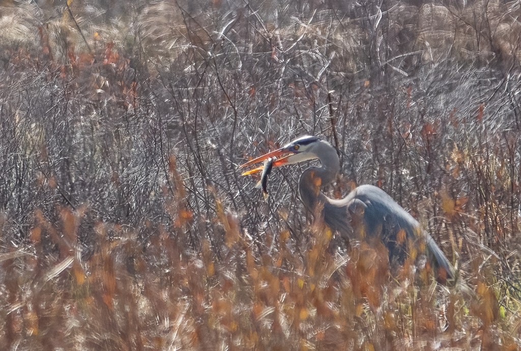 Great Blue Herons stay all summer. In years of watching them, I had never seen one actually catch a fish until last week. As luck would have it, I was in the midst of moving to get a better angle, so this photo is rather wobbly.