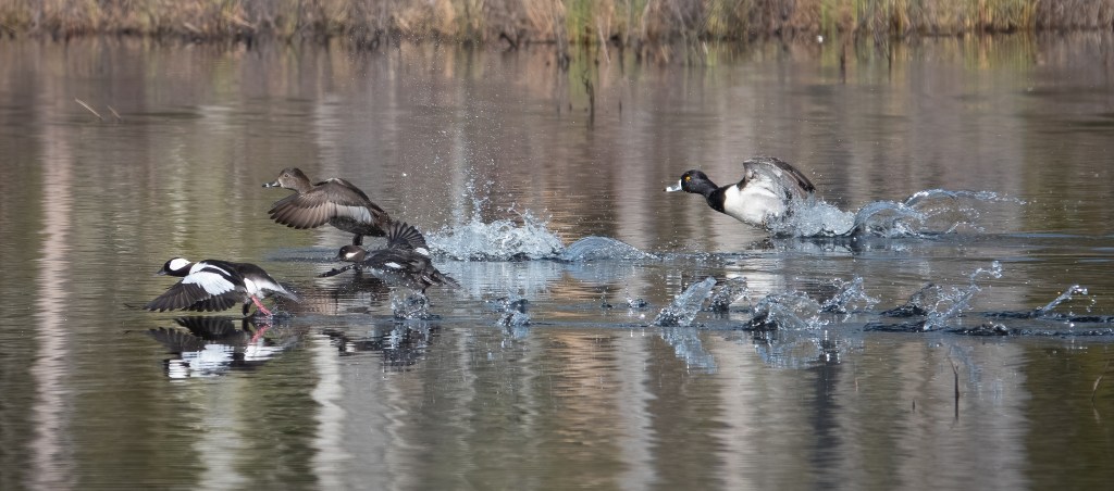 In flight, you can see that the two buffleheads closer to the camera are much smaller than the ring-necked ducks behind them.