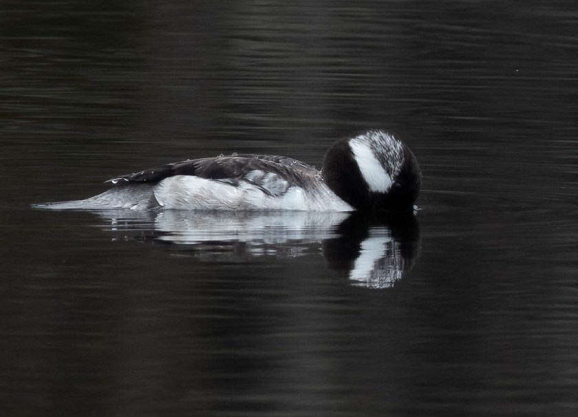Ducks pass through here en route to breed in Canada. The males are in breeding plumage, so they look very smart. Here is a ring-necked duck, a close relative of the UK’s tufted duck
