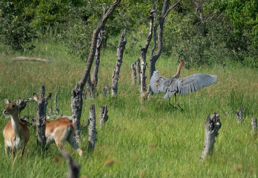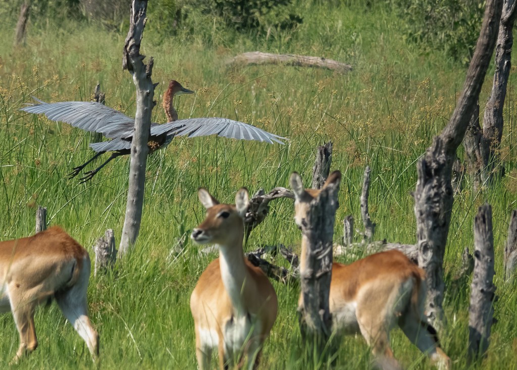 The lechwe stand about three feet at the shoulder, and the goliath heron (the world’s largest heron) is up to five feet, so they can look each other in the eye.