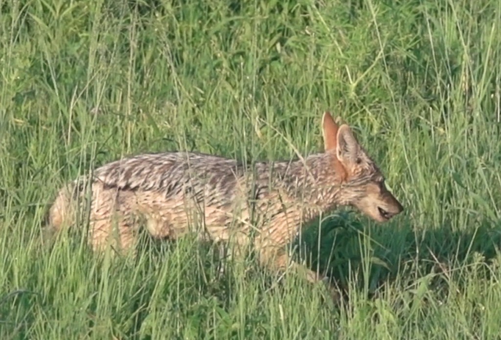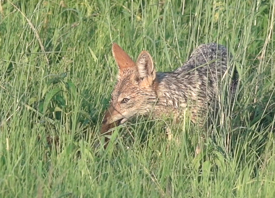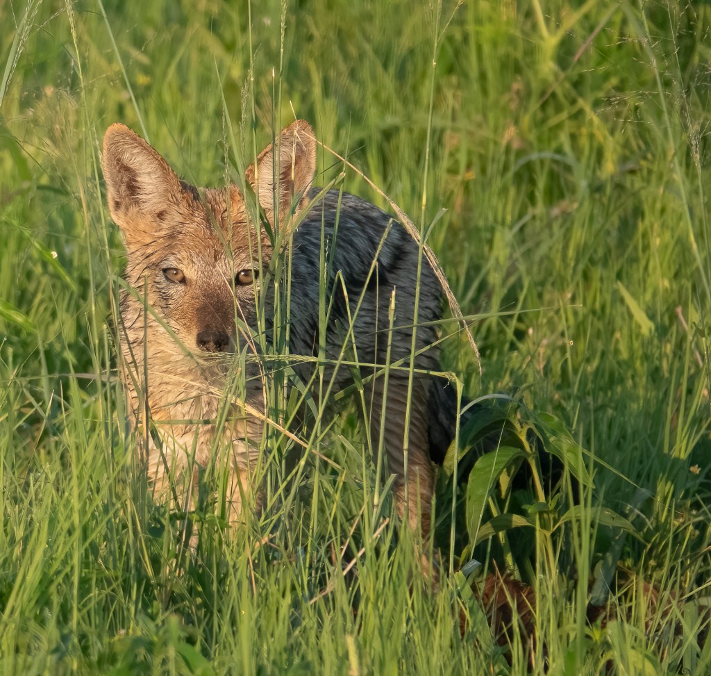 Black-backed Jackals have a varied diet. They’re not just scavengers, especially in an area like the Makgadikgadi where alpha predators are few and far between. This jackal was digging and pouncing on something very tiny in the long grass, early in the morning with its coat tipped with dew: