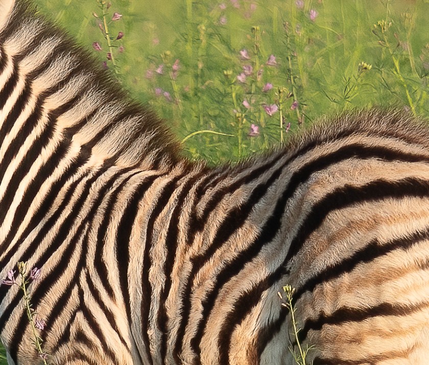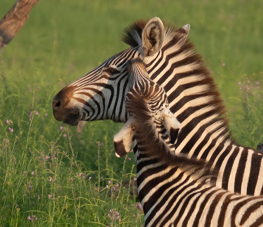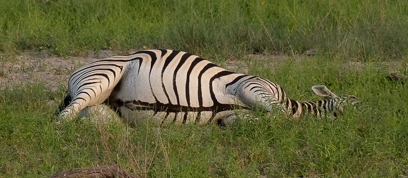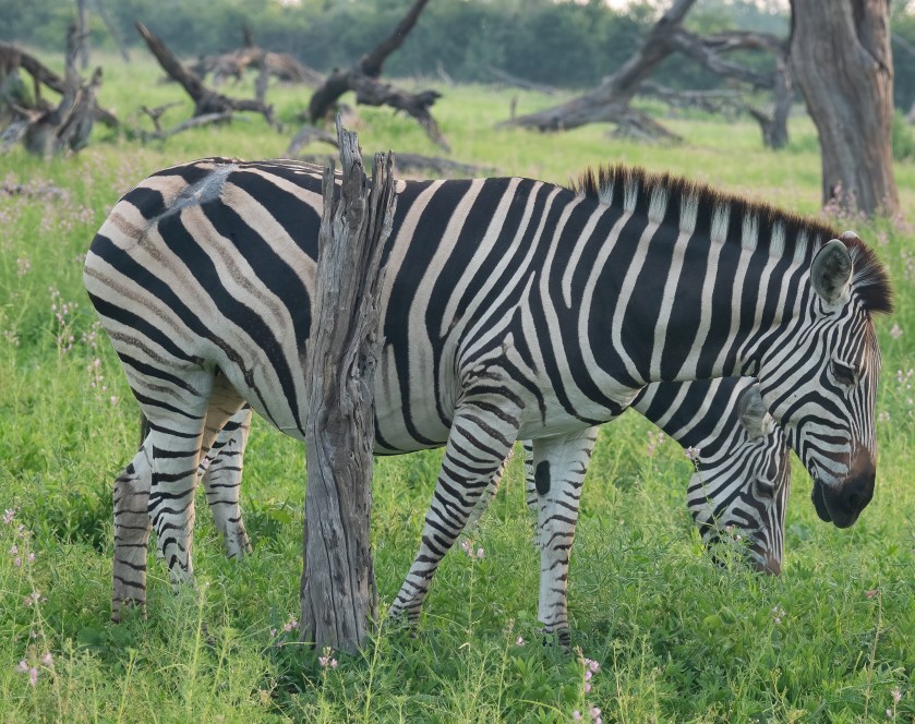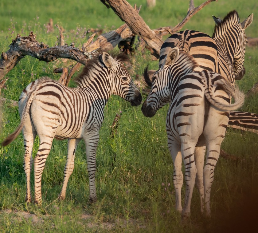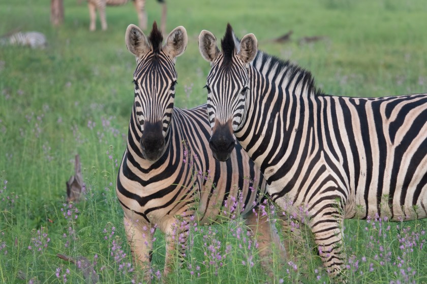 The zebras in this part of Africa are Burchell’s (or Plains) Zebra. Their stripes are separated by ghostly brown shadow stripes, and each animal is slightly different. Look for example at the center of their noses, just below the eyes.