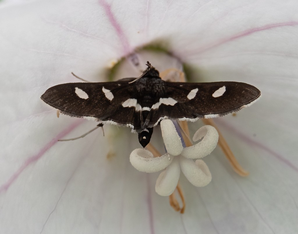 Grape Leaffolder Moth, Desmia funeralis, must be named for its funereal costume: