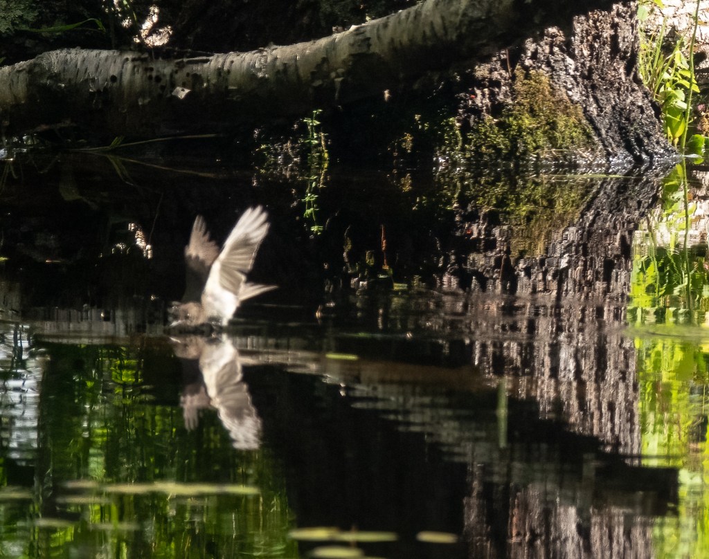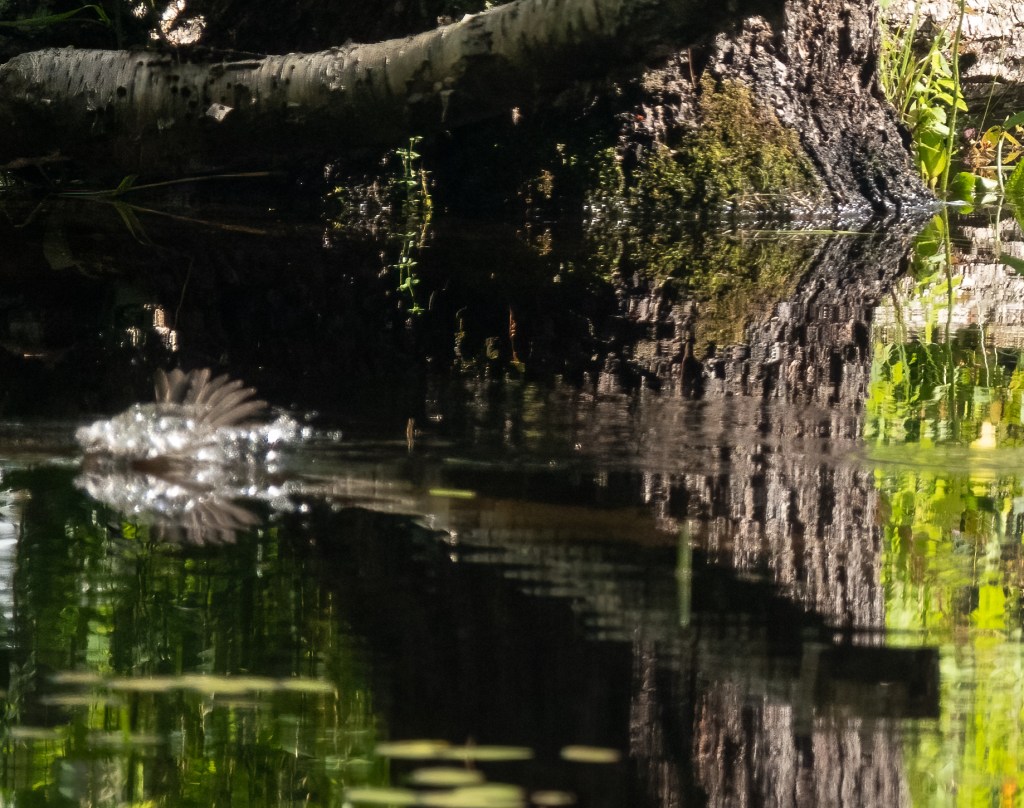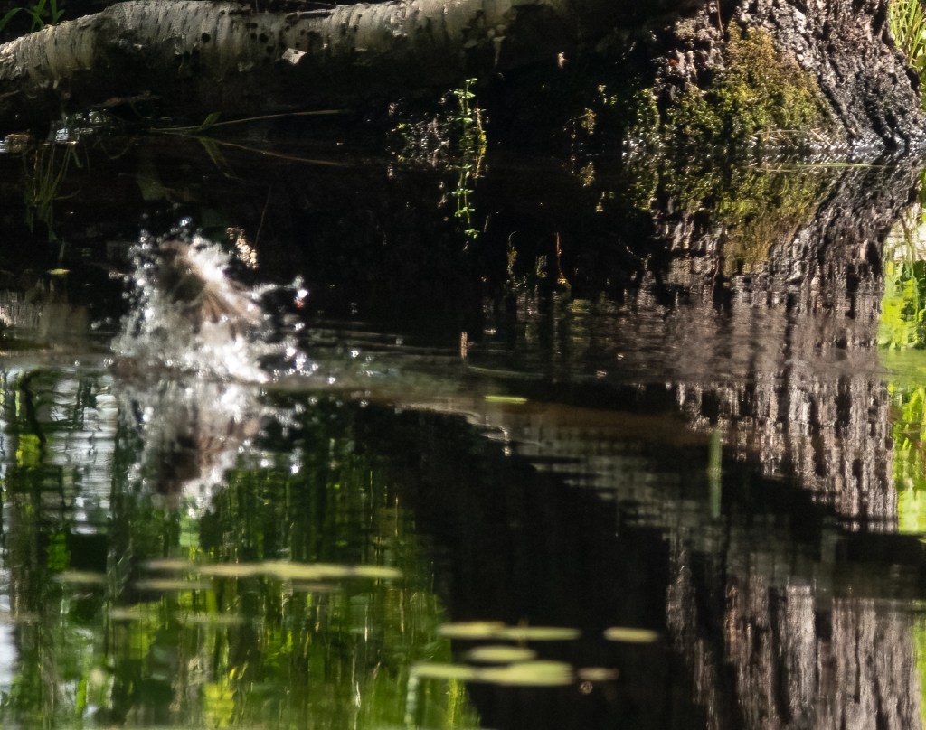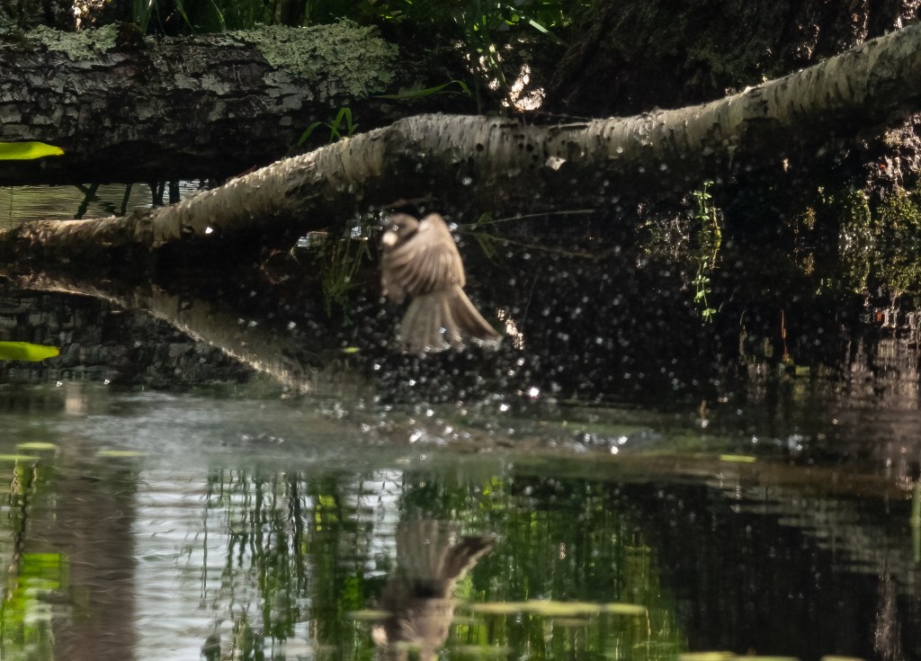 I have been enjoying bath time. This fledgling has been well brought up, and starts its day with ablutions. According to Cornell’s Birds of the World, Eastern Phoebes swoop down from a perch and wet their head and breast, keeping their wings as dry as possible, then return to the perch to groom. This is incredibly hard for me to film, because you don’t know when they are going to launch, where they are going to hit the water, and the return trip perch-water-perch takes less than one second. This sequence is the best I have got, but it will give you a rough idea of their technique.