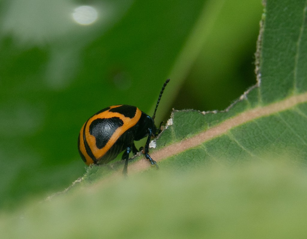 The Swamp Milkweed Beetle, Labidomera clivicollis, sports a smartly tailored livery of orange and black: