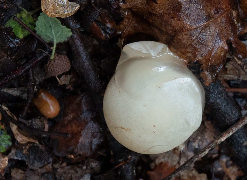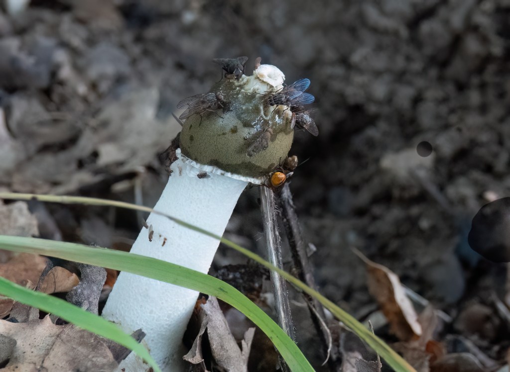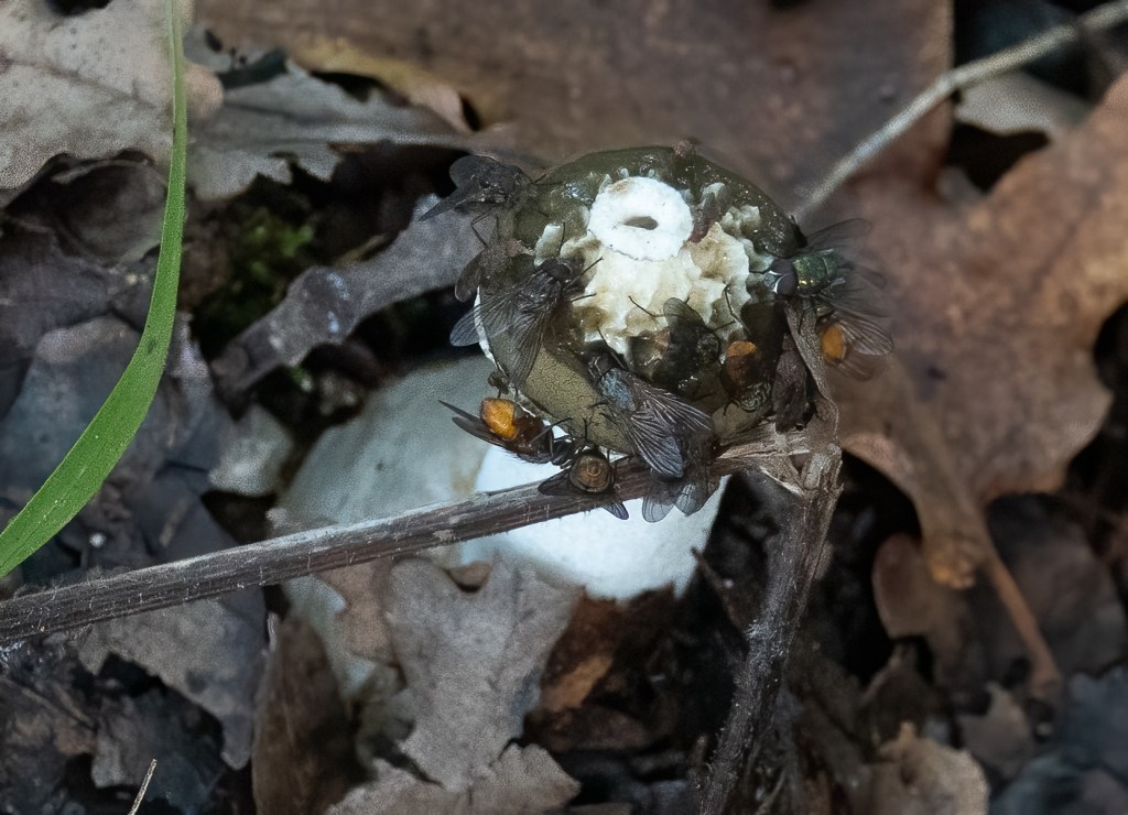 The sticky mucus gets on their feet, and when they fly off they carry it with them, spreading the spores. Rain, time, and enough flies, remove the mucus, leaving a white sculptural shape, with a texture like tripe: