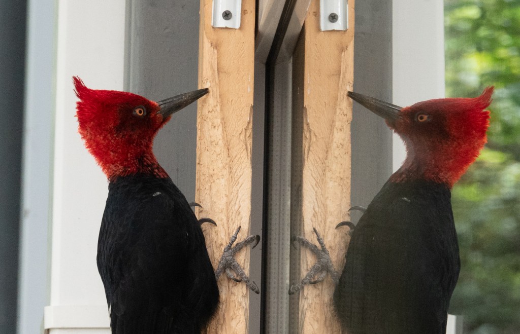 One of the largest woodpeckers in the world lives in Patagonia: the Magellanic Woodpecker, Campephilus magellanicus. This is a handsome male: yes, there’s just one in this photo, though he apparently thinks he’s met a rival, living inside Hotel Lago Grey:
