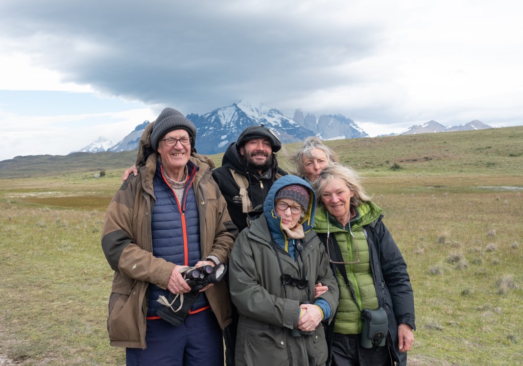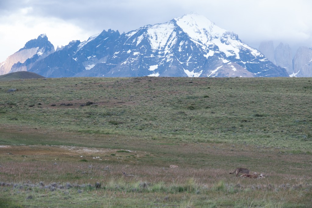 And today, after less than an hour, Angelo our tracker radioed us from quite nearby. With a huge grin, he pointed: there, spread out before us, as if on a stage, were four pumas and one dead guanaco (right foreground). So of course there we stayed, four and a half hours, riveted.
