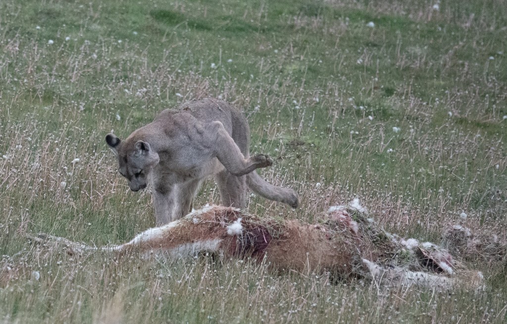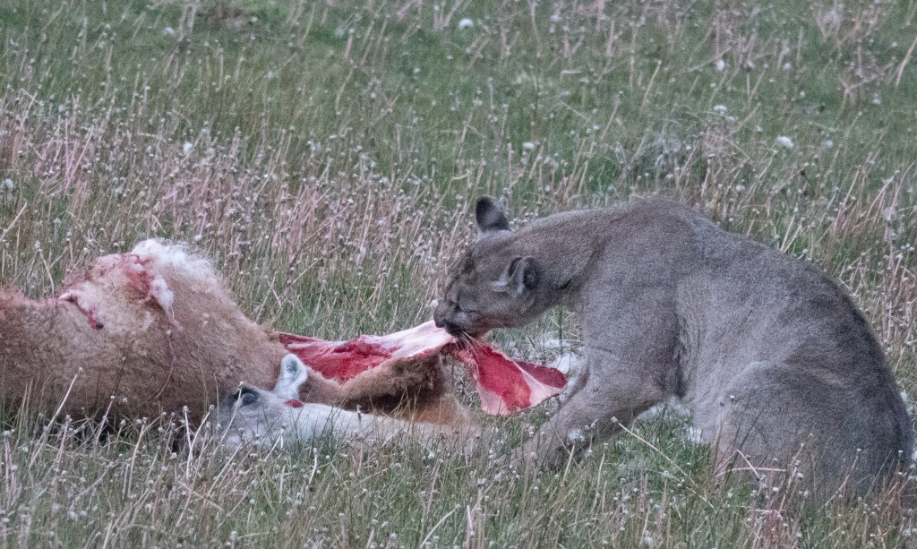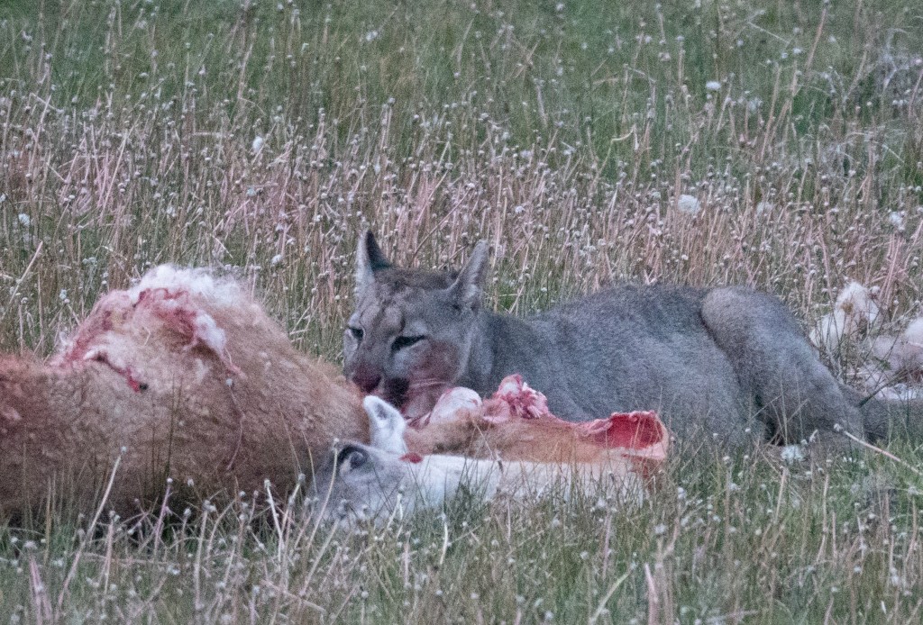 Angelo had seen Petaca the previous evening, looking as though she was hunting, so he had gone searching for her again this morning. She had indeed killed, an adult guanaco, and when we arrived the male cub was still feeding: