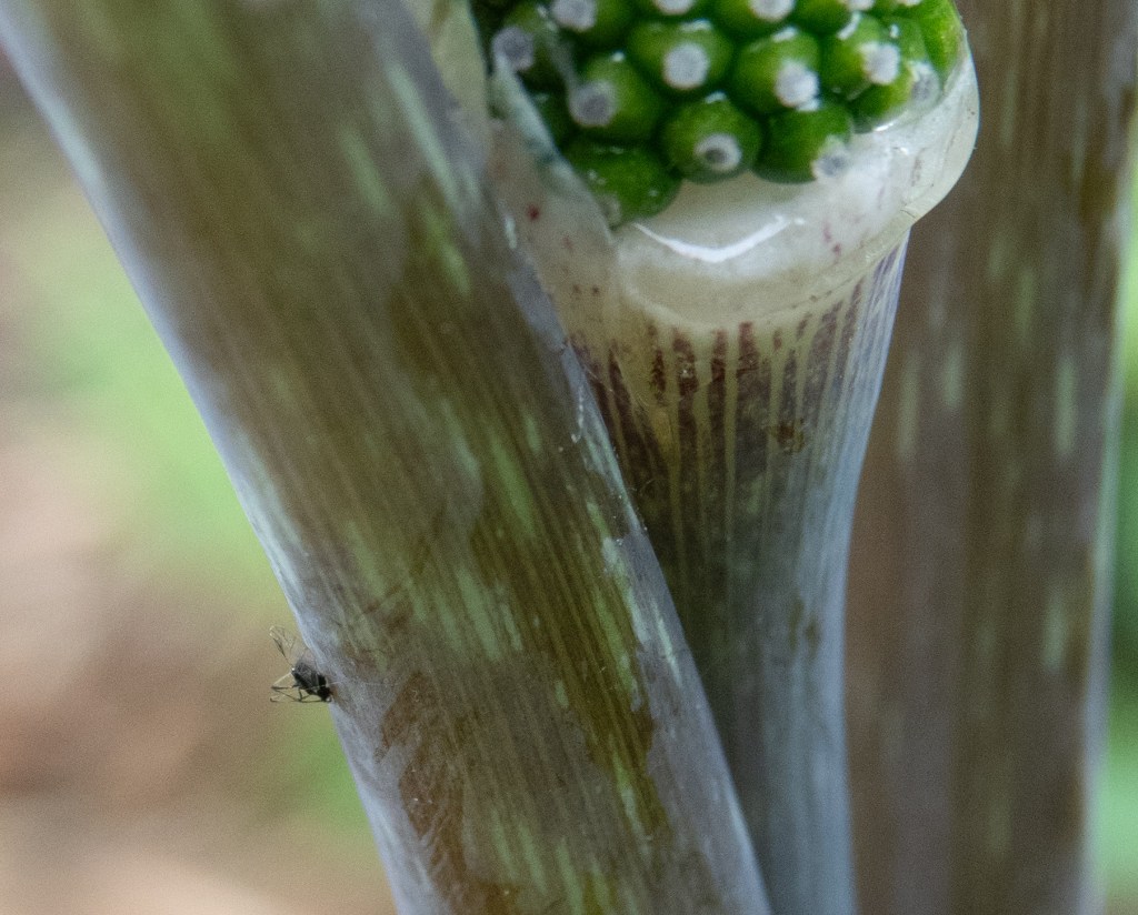 The gnats, being of limited brain capacity, may be duped repeatedly until they eventually enter a female plant where the pollen that they are carrying brushes off on the fuzzy stigmas, thereby effecting pollination. This time there is no escape since the spathes of female plants have no opening in the base of their spathes, and the gnats die within the spathe.”