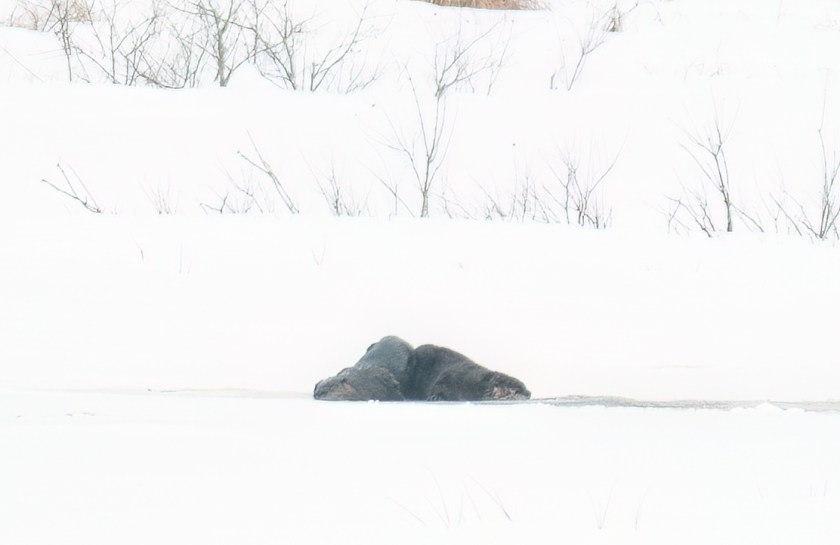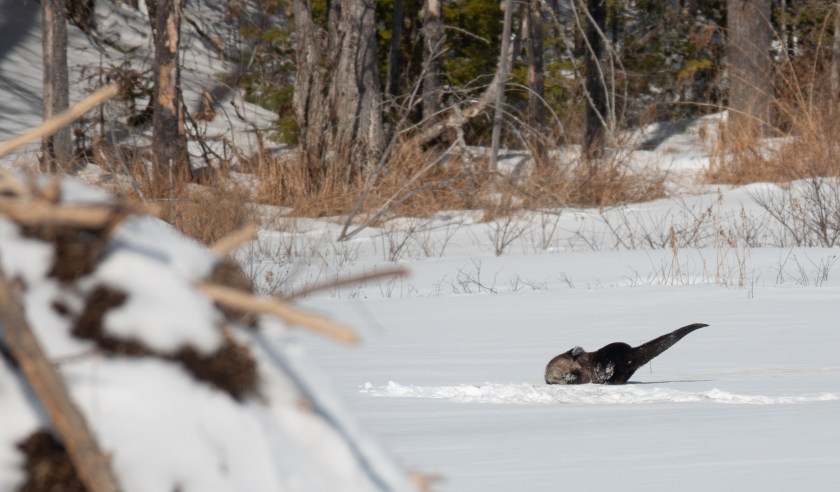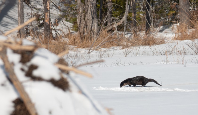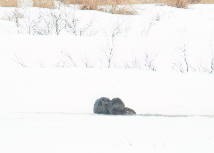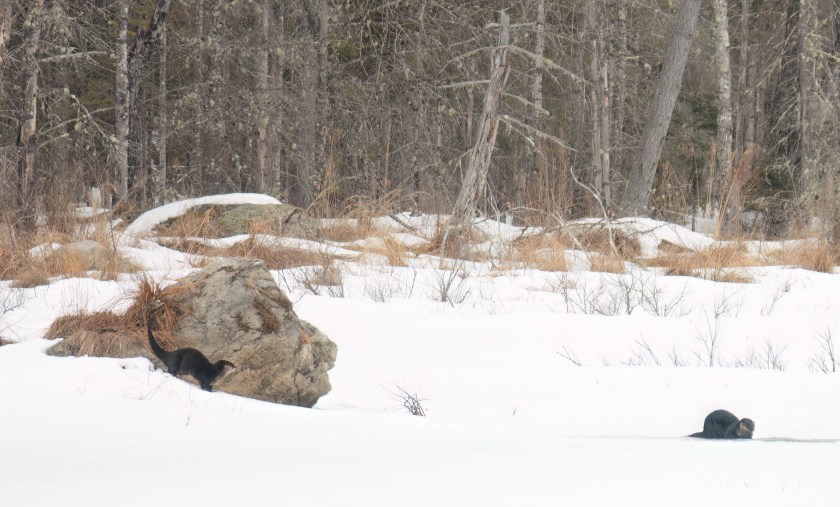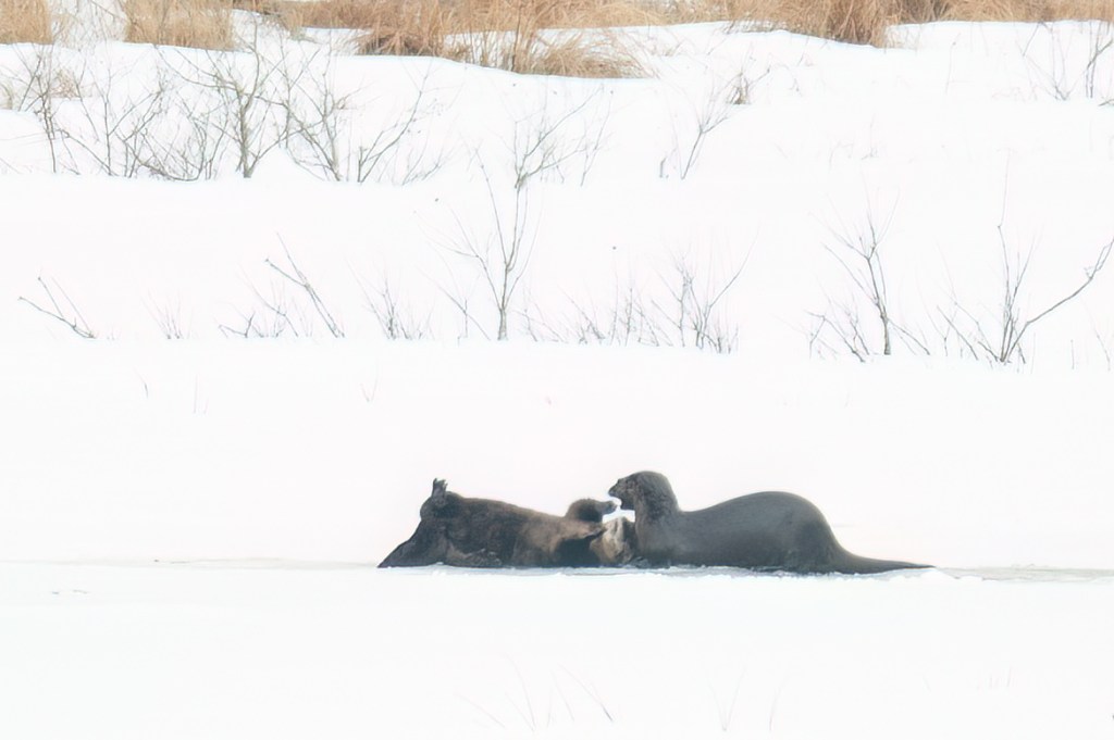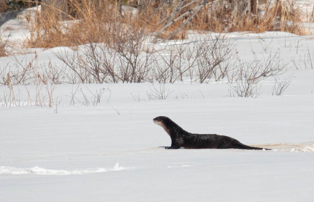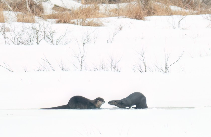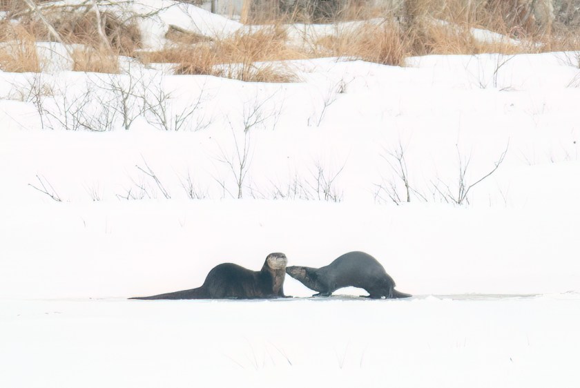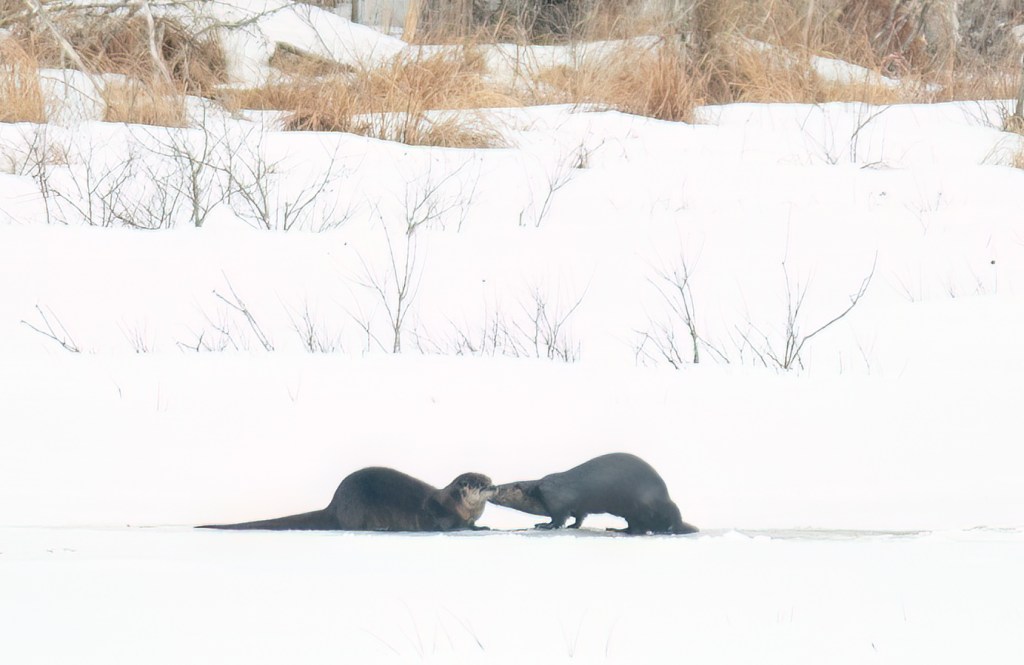 Most of the winter, if I see otters together I assume they are a mother and last year’s young. They behave like puppies, rolling around, diving in, and playing, often fishing out of the same hole in the ice.