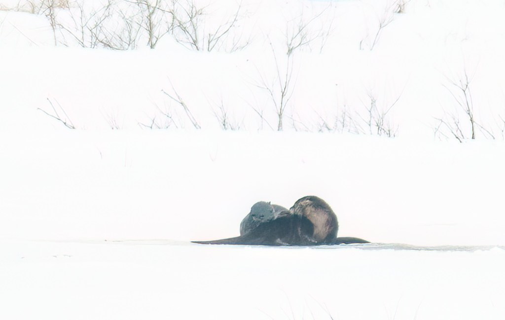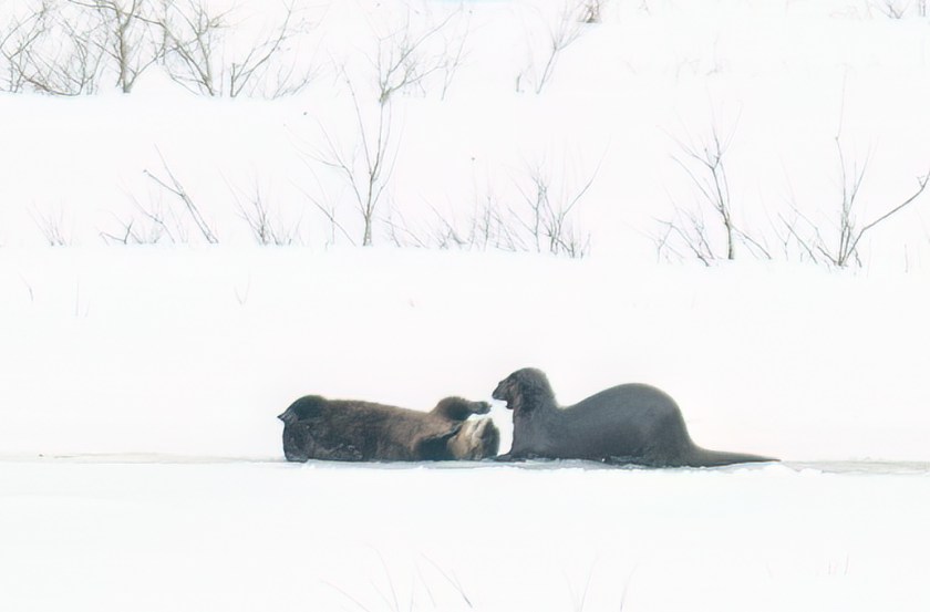 By the time I get back the ice will almost certainly have melted, and any courtship will have long since been consummated, so I end with a link to the only video I could find of river otters mating. It is very, very long, but around six minutes in you can see a commotion in the water, where clearly something is going on, and then they emerge from the water onto land, already conjoined, and making charming chirping sounds. From then on they stay on land, so you can watch and listen for a while if you want.