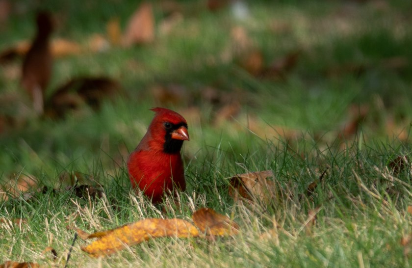 The flashy cardinal is lazy, gleaning sunflower seeds from underneath the birdfeeder: