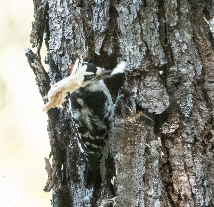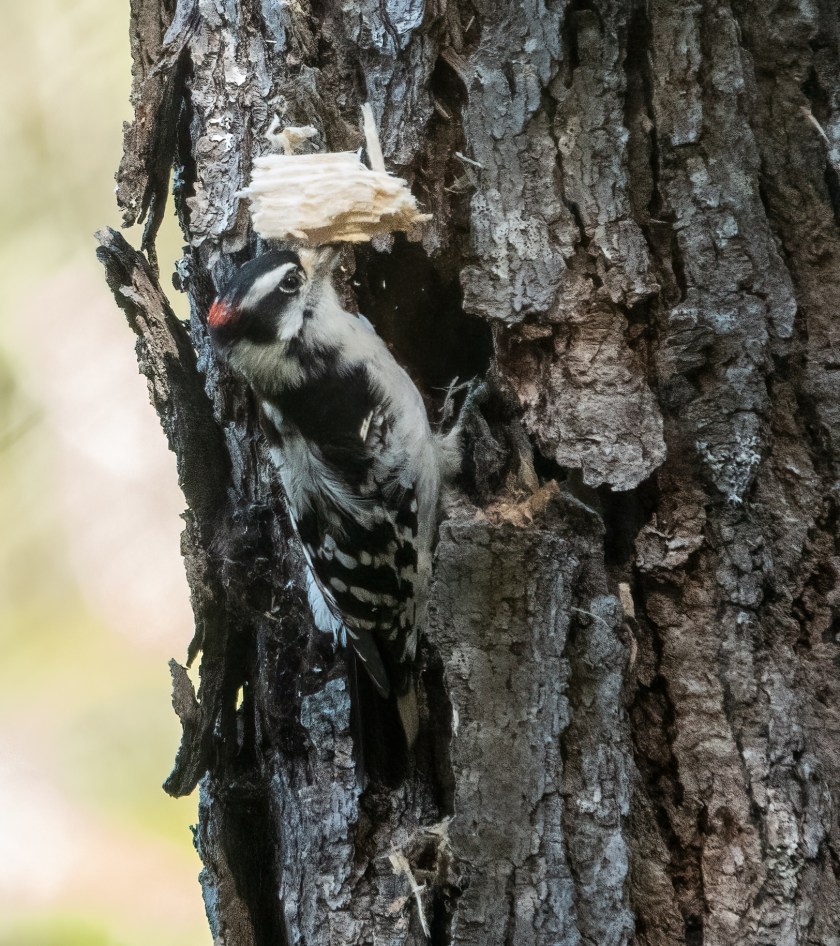 The Downy Woodpecker does not migrate, so it needs a winter roost. Each bird excavates its own; this one is removing hefty chunks of wood. The red head patch indicates that this one is a male: