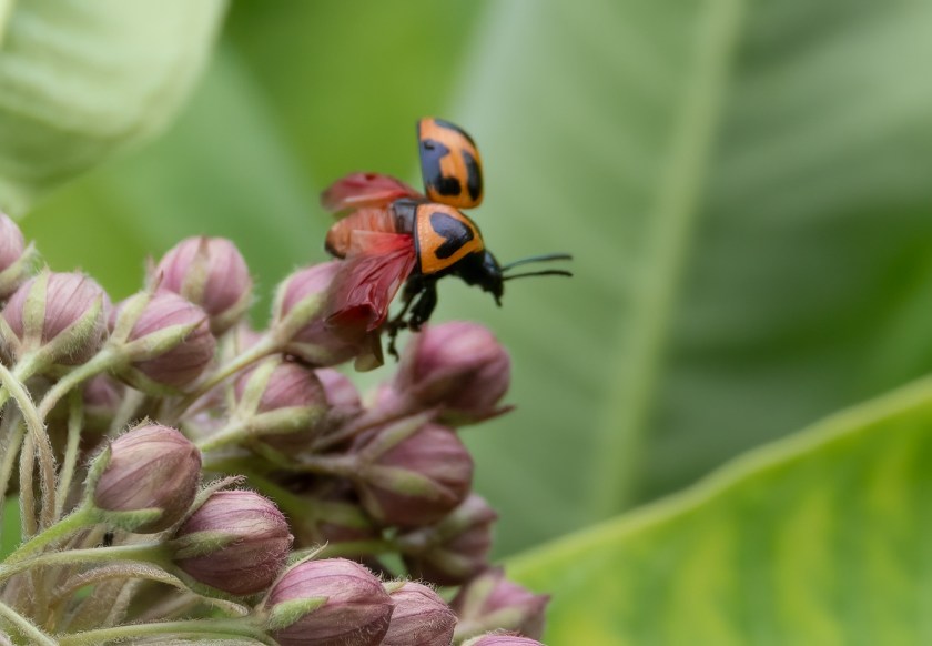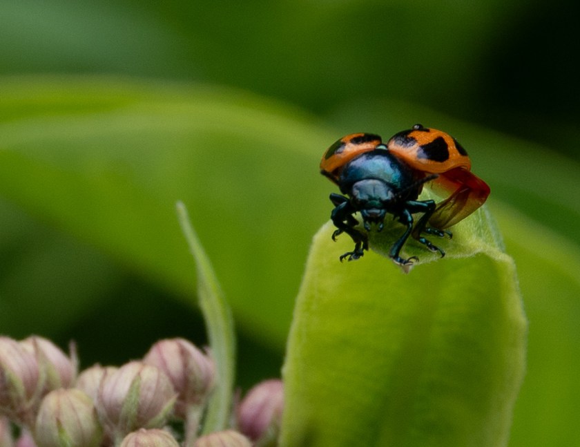 The whole thing was about 1/3″long. I tried to turn it over to see the bug underneath, but it righted itself in a microsecond. But when I put it on my thumb it tried to escape, walking steadily along my thumb looking for an off-ramp: