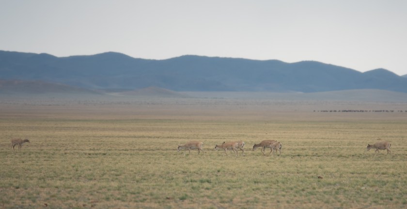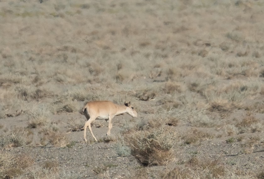 The rugged mountains where the snow leopards live are separated by wide valleys of steppe grasslands. This is Saiga territory. They are skittish, so we never got very close, but we saw a herd of around 30 animals sharing the vast flats with sheep and goats (right in background):