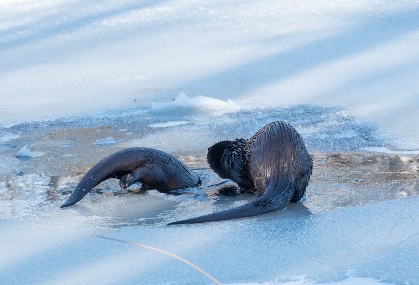 We had had the first proper snowfall of the winter on December 2nd, six inches of lovely fluffy stuff, so on the morning of December 3rd I snowshoed in to our beaver pond. Joy of joys, as I stood on the shoreline two young otters popped out of the ice just a few feet in front of me.